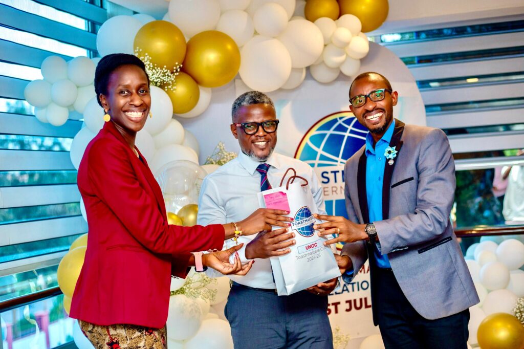 Dinah Oundo, DTM, and Jesse Ainebyoona, DTM, extending appreciation to TM Tony Otoa from UNOC Toastmasters Club.